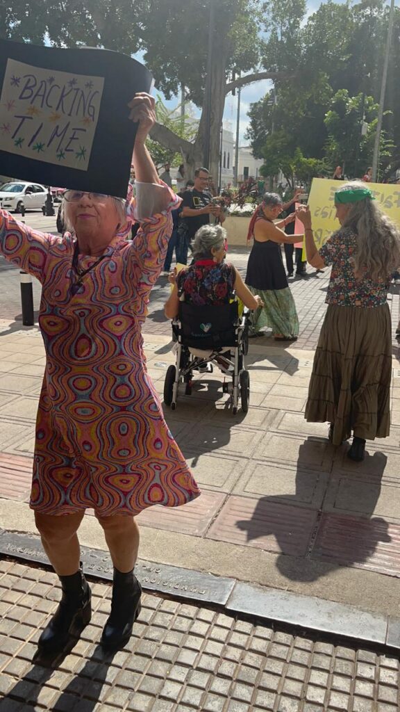 Y no… No regresé a los 70’s y hoy, en la previa del 25N, Día Mundial de la Eliminación de la Violencia contra la Mujer, las activistas del Frente por los Derechos de las Mujeres en Yucatán, bailaron, cantaron y gritaron justicia en las puertas del Palacio de Gobierno al ritmo de dos rolas emblemáticas de distintas épocas: “De reversa, mami”, de El Símbolo y la emblemática “Stayin’ alive” de Bee Gees.