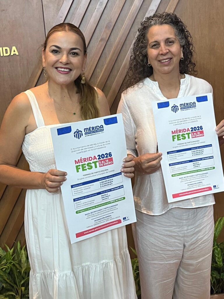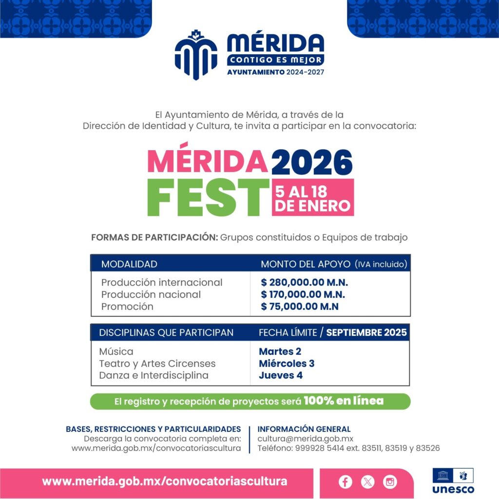 Del 5 al 18 de enero de 2026 Mérida estará de manteles largos porque le tocará celebrar su 484 aniversario. Y para que esta nueva edición del Mérida Fest sea maravillosa, la Dirección de Identidad y Cultura del Ayuntamiento de Mérida te invita desde ahora como artista a que registres tu proyecto a fin de participar en este magno evento. Deberás ser de Mérida o de una comisaría y se aceptarán proyectos de artes circenses, danza, interdisciplina, teatro y música. La alcaldesa Cecilia Patrón Laviada informó que hay 2.5 MDP para la comunidad artística que participe.